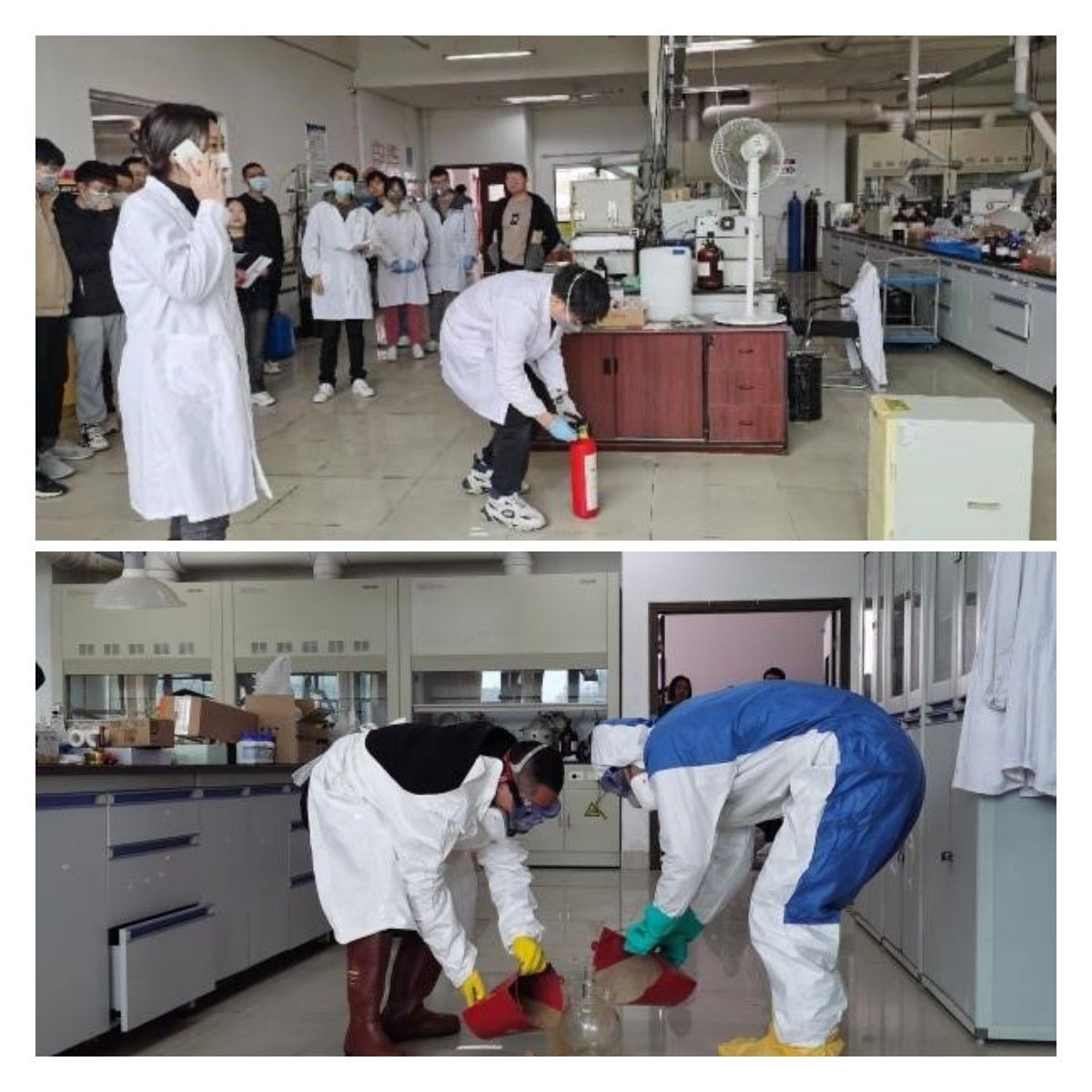 本次演练模拟了实验室设备起火和危险化学品泄漏两个场景。在面对实验室设备突然起火时,两名实验人员反应迅速,一人将情况上报应急处置小组,安排断电和人员疏散,另一人快速使用二氧化碳灭火器灭火。面对危险化学品倾撒于地面的情况,应急处置小组组织应急抢险人员身着防护服、佩戴防毒面罩迅速进入现场,用沙土覆盖吸收泄漏的液体。