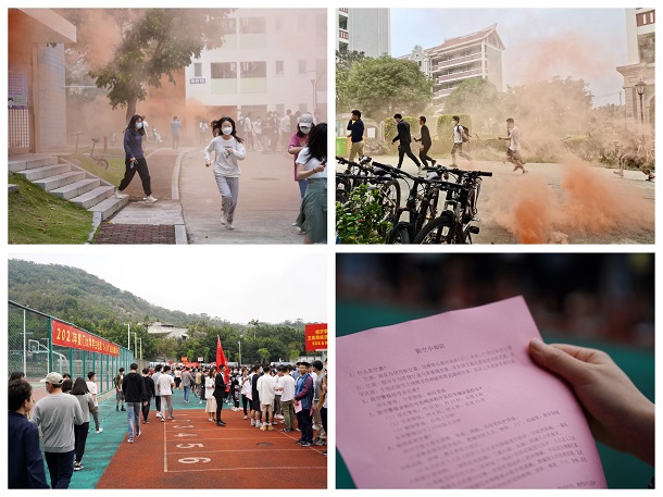 早上7点整,警报骤然响起,园区烟雾弥漫。同学们或戴口罩、或用湿毛巾捂住口鼻,呈弯腰姿态小步快走,紧张有序地在工作人员和志愿者的引导下撤离至疏散集中点。各学院负责人开始清点人数,并在现场为同学们发放厦门市“5·10”试鸣防空警报活动小贴士,普及应急疏散知识、开展防空防灾教育。