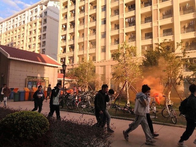 早晨7时,志愿者准时燃放烟雾弹,宿舍园区内顿时浓烟滚滚,刺耳的警报声划破长空,同学们纷纷从各自宿舍撤离,后勤集团、公寓办及学院志愿者组织学生有序疏散,同学们沿着消防疏散路线快速撤离至安全区域集合。