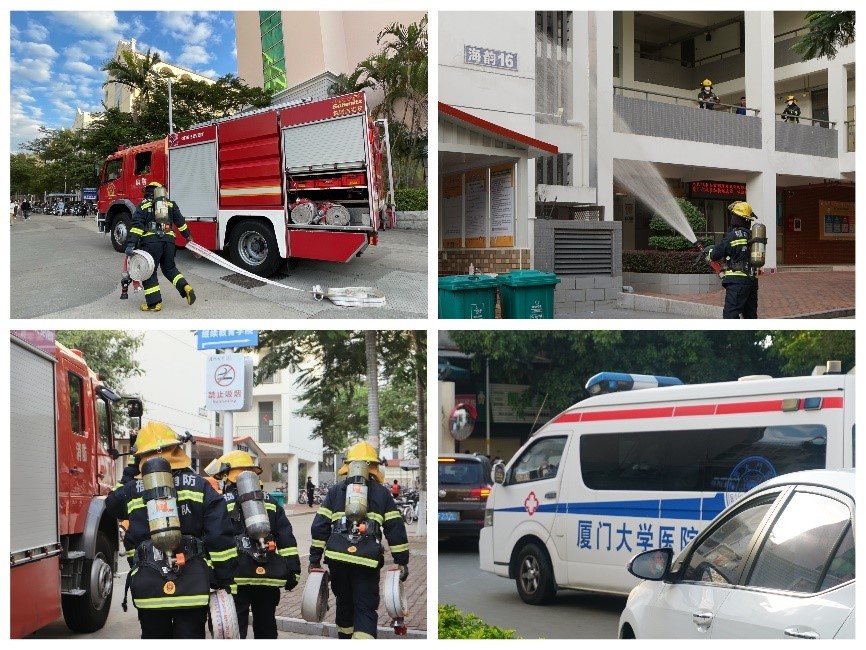 在演练现场,消防队伍迅速赶到“火场”,用水枪“浇灭火源”、处置“险情”。救护车早已准备就绪,时刻保卫厦大师生的人身安全。各学院在集中点进行人数清点,并现场为同学们发放消防小贴士,以消防知识问答的方式普及消防知识、开展安全教育。整个过程紧张有序,演练圆满完成。据统计,本次演练共有7500多名同学参加,覆盖近30个学院。
