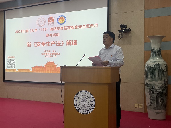 新《安全生产法》自2021年9月1日起颁布实施,作为安全生产领域的综合性、基础性法律,新安法充分体现了关于安全生产的重要论述精神,贯彻了党中央、国务院近年来关于加强安全生产的一系列重大决策部署。为进一步推动新《中华人民共和国安全生产法》和新《中华人民共和国消防法》的普及,11月18日,厦门大学保卫部(处)联合实验室与设备管理处结合2021年厦门大学“119”消防安全暨实验室安全宣传月系列活动,邀请我校法学院的博士研究生陈昊泽博士为师生做新《安全生产法》解读的专题讲座。学校各单位负责安全工作的领导、安全管理员、实验室秘书以及学生安全委员参加了此次讲座,讲座以线下与线上相结合的方式召开。讲座由保卫部(处)副部(处)长涂建芳主持。
