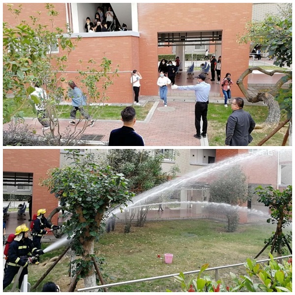 中午1点,活动正式开始。随着三个园区中庭空地处烟雾升起,火灾警报信号响起,各部门工作人员迅速响应,组织各楼栋内同学快速有序撤离,按指定疏散路线往南强广场开阔地集中。与此同时,校卫队员和物业保安启用楼内消防栓,实施灭火作业;保卫干部引导从校外赶到的4辆消防车赴现场支援灭火,并营救伤员;在随后赶到的救护车和医护人员简单处置后,用担架抬出园区送往医院。本次消防疏散演练圆满完成。