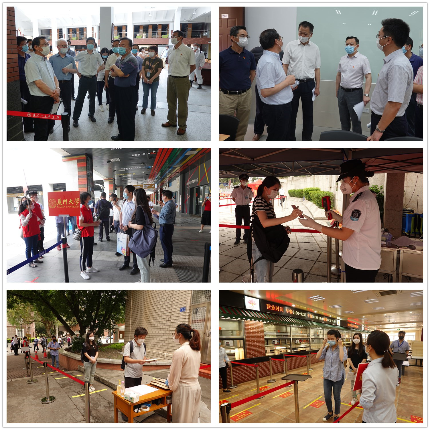 按照相应的工作方案,本次演练模拟了厦门北站接站、思明校区入校、学生公寓入住、食堂用餐、自驾车来校、教室上课、图书馆入馆等工作流程,对现场处置突发事件进行磨合:在厦门北站,学生陆续出站,根据学校标识和志愿者引导,佩戴口罩前往接站点,按学院分组,保持1米间距排队,核验人员对其测量体温,查看身份证、校园卡等相关证件,检查“i厦门”健康码,引导到等待区集中乘坐学校车辆返校;到校后,车辆凭学校返校车辆专用标识进入海韵学生公寓,在一期食堂门口停靠,入住海韵公寓的学生下车后,车辆驶出公寓门口,经环岛路从大南校门驶入思明校区,在勤业餐厅门口和三家村广场停靠,待学生下车后,车辆从群贤校门驶出;在群贤校门口,学生家长准备驾车入校,执勤人员进行引导,告知不得入内,车内学生下车,自行按规定排队接受核验入校;在南光七学生公寓,工作人员引导学生有序进入通道,保持1米间距排队,学院相关人员发放“健康大礼包”,门岗保安逐一检查口罩佩戴情况并测量体温,体温正常的学生刷卡进入楼栋返回宿舍;在芙蓉餐厅,工作人员在入口引导用餐师生保持1米间距排队,检查用餐师生口罩佩戴情况并测量体温,体温正常的用餐师生进入食堂,到菜台点菜、落座用餐,或直接到快速取餐窗口购买套餐后离开;在庄汉水楼,上课师生进入教学楼,志愿者检查师生口罩佩戴情况并测量体温。体温正常的师生进入教室,教师调试线上线下同步直播设备、现场教学设备,开始上课。课程结束后,师生有序离开,教室管理人员开展卫生清扫、消毒。在图书馆,读者在工作人员引导下,保持1米间距排队入馆,接受体温检测,正常者入馆。