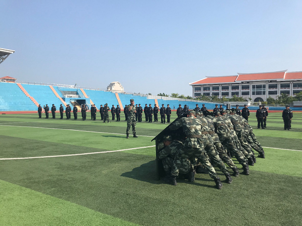 为广大师生营造安全、和谐、稳定的校园环境,身为校区的安保人员,掌握一些应急处突的技巧是十分必要的。4月23日下午3点,翔安校区组织全校区近两百名安保队员齐聚在一期田径场参加防暴恐应急处突演练。本次演练特地邀请厦门武警支队某特战中队官兵进行现场指导。