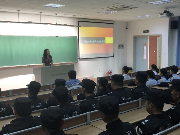 铁打的校区,流水的“兵”。校区安保人员大部分来自周边社区,待遇不高,流动性大。如何让我们的安保人员从村民转变成校区服务者,能够热爱校区,心系校区,对校区有归属感,共同为校区安全保卫添砖加瓦,一直是摆在校区保卫办队伍建设工作的第一位。建立完善校区安防人员培训制度便是做好校区安保队伍建设的重要环节。自校区启用以来,通过每年开展业务培训,校区保卫办不断提高校区安保队伍的组织性、纪律性和集体观念,提高处置各类问题及突发事件的能力,强化其专业技能,确保队伍的整体素质不断提升,有效杜绝安全隐患,维护校区良好秩序,为广大师生的安全和校区长治久安提供有效保障。