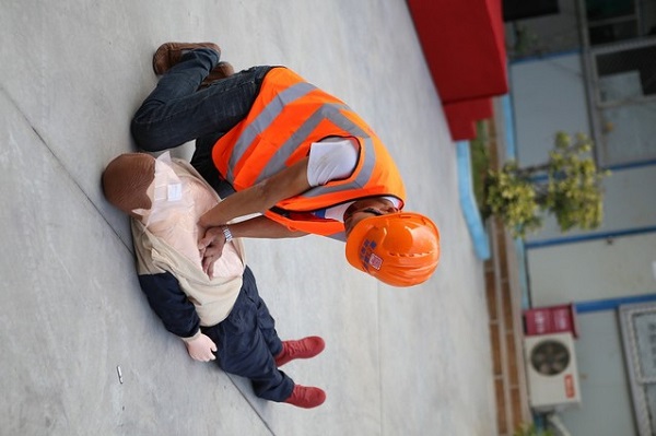 演练现场,翔安区消防大队官兵现场讲解消防器材的使用方法及消防知识,蓝天救援队为在场人员演示了心脏复苏术的动作要领。消防实操演练开始后,演练模拟实验室二层突然冒起浓烟并伴有火光,施工人员收到警示后立即停止工作,现场警声响起,灭火组启动消防设施,切断作业区施工用电,快速灭火控制火势,警戒组设置警戒线,并拨打火警和120急救请求增援。每个团队各司其职,井然有序地开展救援工作。在大家的共同努力下,火势没有蔓延,大火很快就被成功扑灭,“伤员”被及时救出并送往“医院”进行救治。