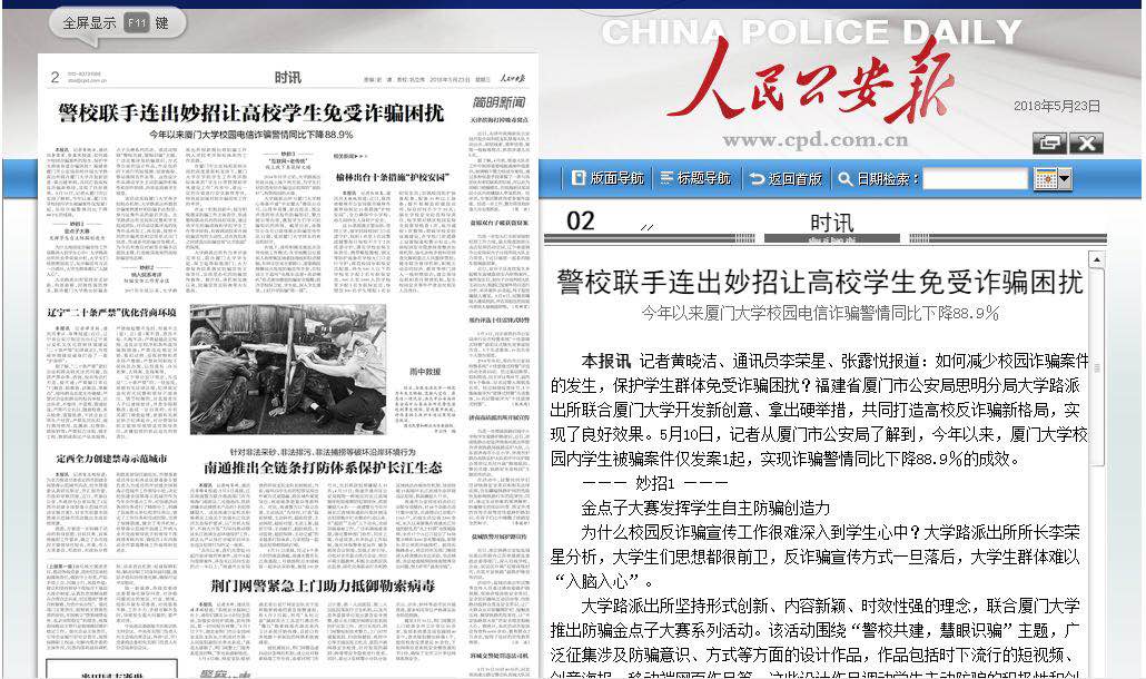 在厦门市公安局和思明分局的高度重视和支持下,厦门大学在学院学生工作考评指标体系的“学生日常管理和学风建设工作”内容中,拿出一定的分值进行安全教育考评,特别是加强对防诈骗宣传工作的考评。