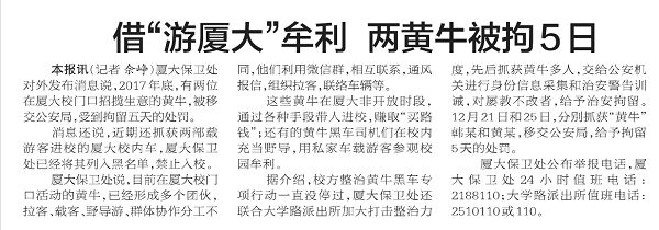 厦大保卫处对外发布消息说,2017年底,有两位在厦大校门口招揽生意的黄牛,被移交公安局,受到拘留五天的处罚。