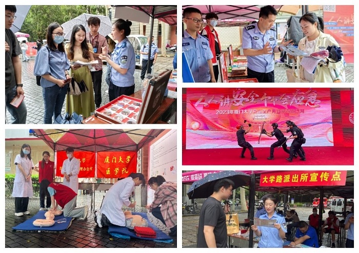 在活动现场,思明区巡特警的警官们进行了擒拿格斗展示,并给同学们演示讲解格斗术;厦门市禁毒办的警官们展示了毒品仿真样品,给同学们讲述了毒品的种类和危害;学校医管办联合医学院的同学们给大家展示了心肺复苏操作流程,一堂生动的心肺复苏急救课;厦港消防救援站的警官们指导同学们参与模拟灭火演练,给同学们普及消防安全知识;大学路派出所的警官们现场开展防诈骗宣传,给同学们宣传防骗之“九个凡是”等。
