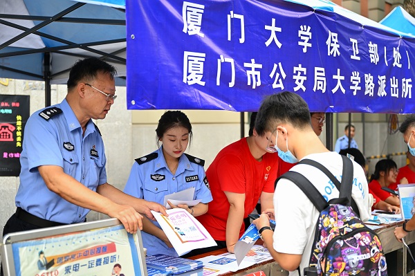 七点多的三家村迎新点已有许多新生来注册报道,支部党员以三家村为中心,联合大学路派出所开展安全教育宣传,通过邀请新生参与反诈答题,参观仿真毒品,观看消防、国家安全、反邪教等宣传册,为新生在三家村上了“安全第一课”,也为新生分发了专门定制的小礼品。