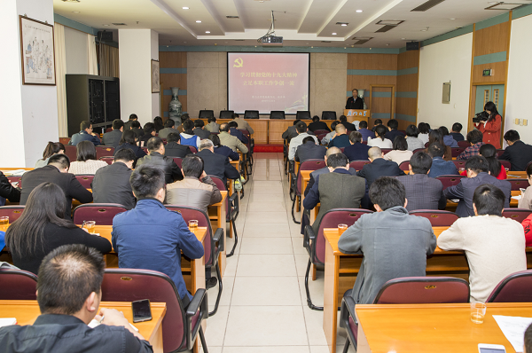 1月2日上午,校党委副书记林东伟在颂恩楼220会议室作题为《学习贯彻党的十九大精神 立足本职工作争创一流》专题党课。宣传部、学生处、保卫处、校团委的5个党支部90名在职党员参加学习。党课由学生处处长、学生处第一党支部书记夏侯建兵主持。